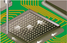 第二種是在錫膏焊接之后點(diǎn)涂底部填充膠,也是在smt貼片中最常見(jiàn)的底部填充膠的使用方式,利用良好的流動(dòng)性滲透到倒裝芯片的底部,然后加熱固化,這種底部填充膠相比較而且對(duì)于固化要求相對(duì)沒(méi)有那么苛刻,而且需要點(diǎn)膠機(jī)通過(guò)點(diǎn)膠的方式作用。