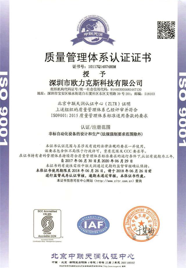 最后專家組成員一致通過審核,深圳市歐力克斯科技有限公司非標自動化設備的設計、生產、銷售和質量管理體系符合認證要求,運行有效,成功通過ISO9001:2015質量管理體系認證證書,進一步證明了我公司在非標自動化設備領域的銷售質量和服務水平,歐力克斯一直在不懈努力前行!