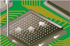 這些關(guān)鍵問題包括:得到完整的和無空洞的芯片底部膠流,在緊密包裝的芯片周圍分配膠,避免污染其它元件,通過射頻外殼或護(hù)罩的開口滴膠,控制助焊劑殘留物。取得完整和無空洞的膠流,因?yàn)樘畛洳牧媳仨毻ㄟ^毛細(xì)管作用吸入芯片底部,所以關(guān)鍵是要把針嘴足夠靠近芯片的位置,開始膠的流動。