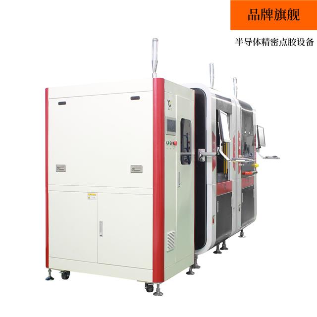 技術(shù)特點(diǎn) 晶圓點(diǎn)膠機(jī),伺服絲桿,龍門結(jié)構(gòu),雙Y、雙X軸,運(yùn)行穩(wěn)定;搭載自研壓電式噴射閥,大視野視覺相機(jī),點(diǎn)膠精度高 機(jī)械手搬運(yùn)機(jī)構(gòu),采用上銀4軸微小型機(jī)器人進(jìn)行搬運(yùn) 機(jī)械手自動(dòng)把點(diǎn)好膠的晶圓搬運(yùn)到真空烘烤機(jī)中,自動(dòng)關(guān)閉艙門在真空環(huán)境中利用光照烘烤固化