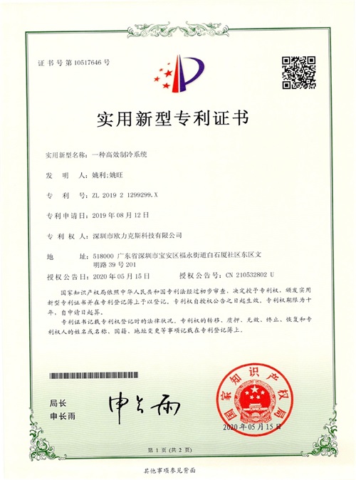 高效制冷系統(tǒng)專(zhuān)利證書(shū)