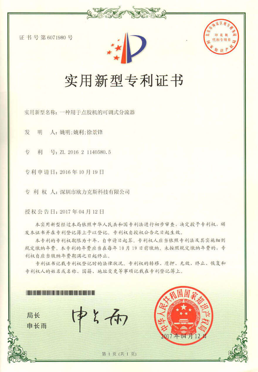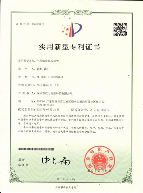 螺旋控膠裝置專(zhuān)利證書(shū)