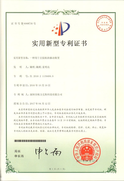 點(diǎn)膠機(jī)的驅(qū)動(dòng)裝置專(zhuān)利證書(shū)