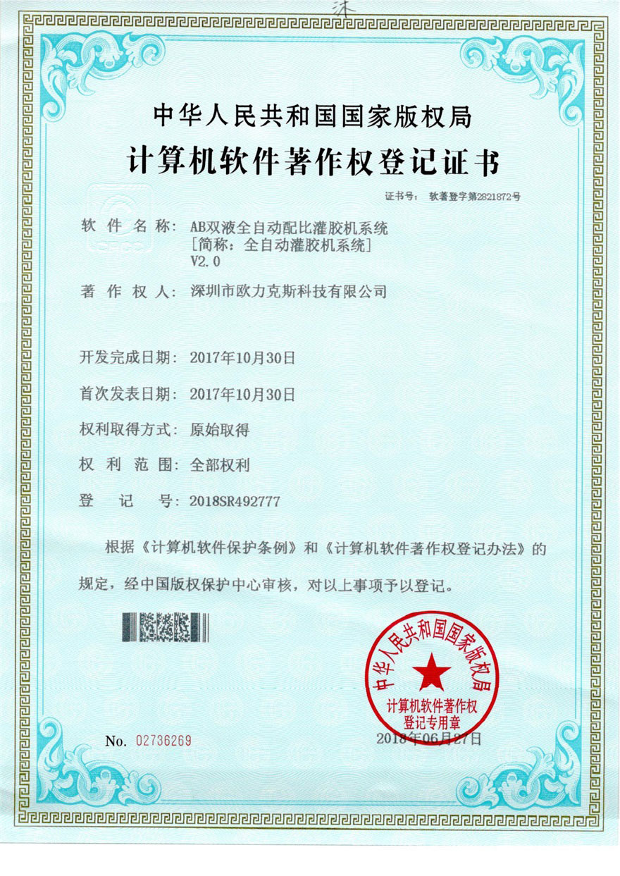 AB雙液全自動(dòng)配比灌膠機(jī)系統(tǒng)V2.0登記證書(shū)