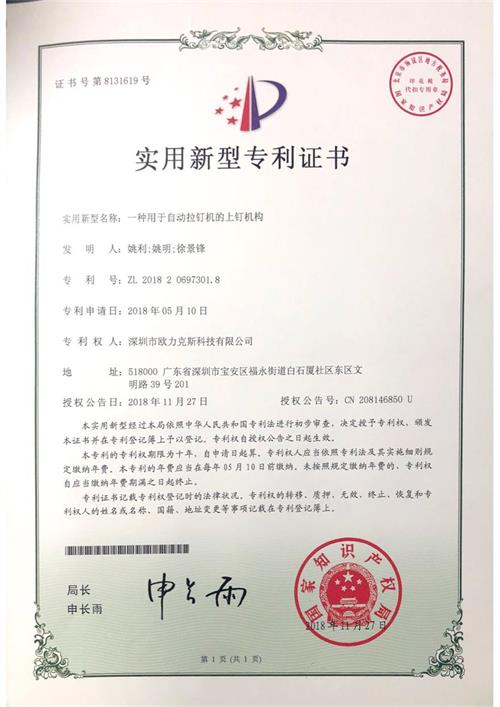 自動(dòng)拉釘機(jī)的上釘機(jī)構(gòu)專(zhuān)利證書(shū)